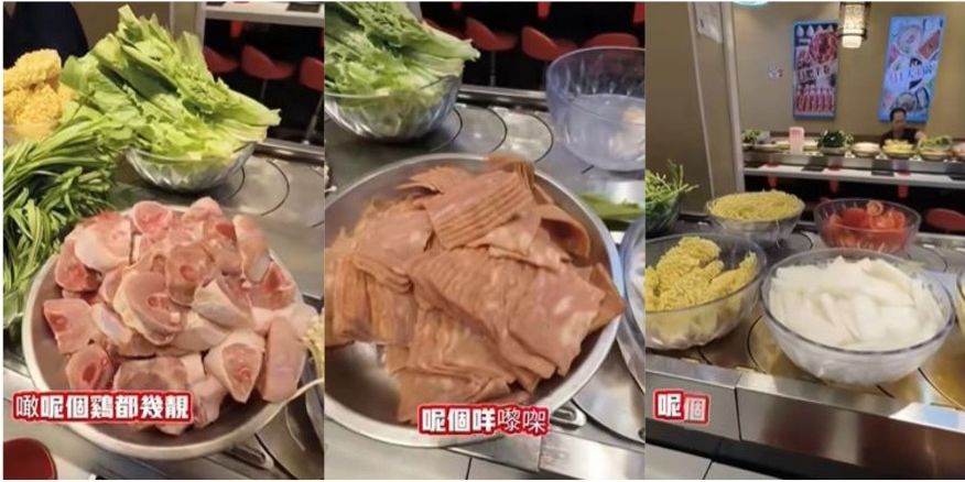 ▲片段可見火鍋食材采用回轉形式運送,種類繁多,供應蘿卜、即食面、雞件、蔬菜、腸仔、豆腐等等。