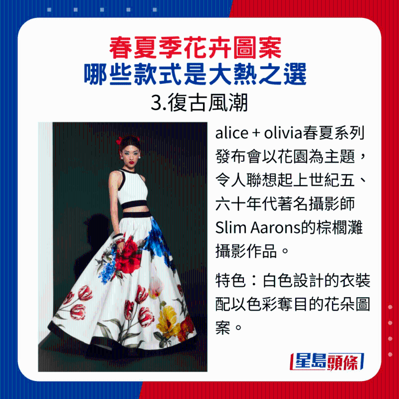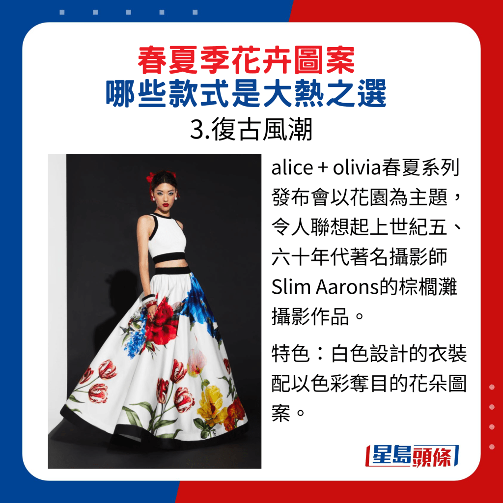 至于alice + olivia的主題是黑白舞會,為向上世紀六十年代的美國作家Truman Capote致敬,當中的Cocktail Dress或半截裙,在黑白色上配襯色彩鮮艷的花卉圖案,藉對比視效凸顯淑女魅力。