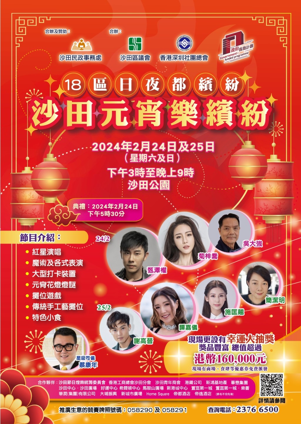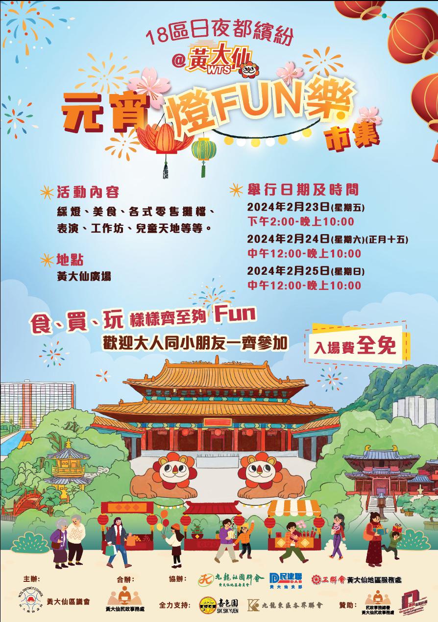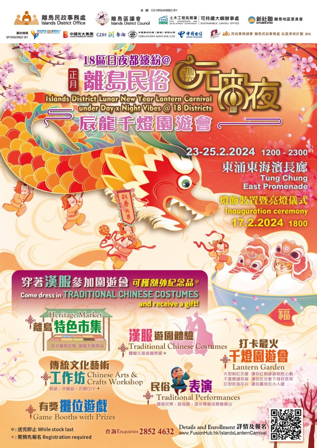 嘉年華內容豐富多彩,有民俗表演、有獎攤位游戲、傳統文化藝術工作坊,更有離島特色市集,售賣離島特色商品如特色飲食同生活百貨。 元宵最重要是一家大細團團圓圓,場內寵物友善,歡迎市民前來食、玩、買。