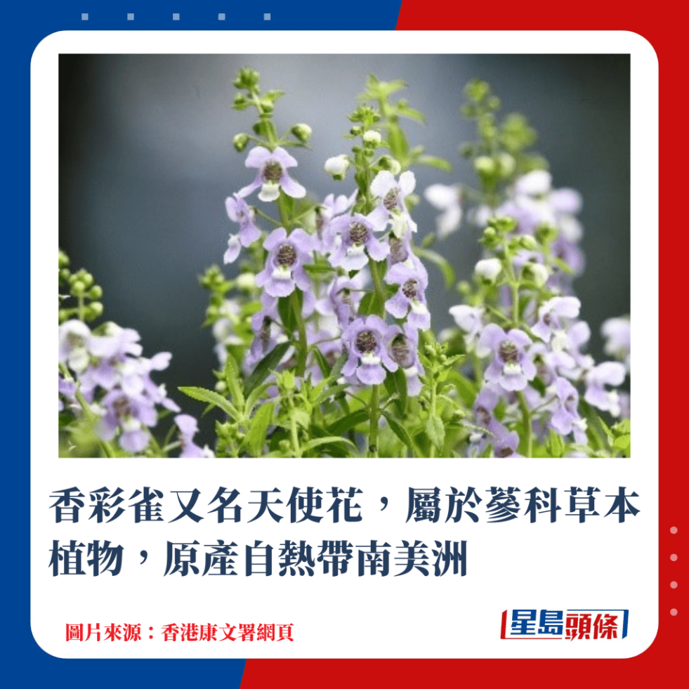 今屆花展的主題花為“香彩雀”,此花又名天使花,小巧別致的花形和清新的香氣,花量豐富(如白、紅、粉紫、藍紫色等),莖株滿布小花蕾,盛開時茂密有致。 花朵迎風搖曳,宛若萬千彩雀躍動,盛放期為夏季,耐熱、觀賞期很長,讓人充滿活力、喜悅無限。