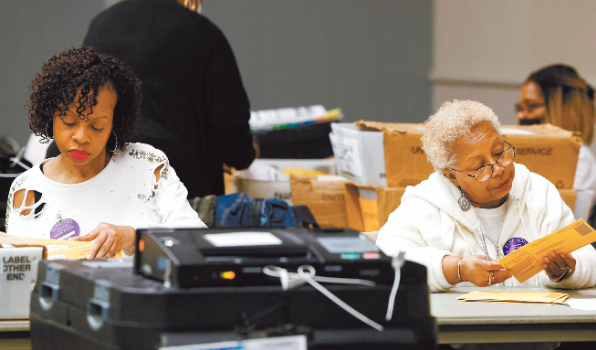 ▲密歇根州初選27日舉行,選情備受關注。圖為工作人員清點票數。路透社