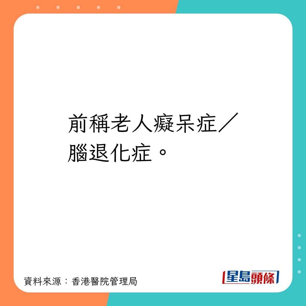 根據香港醫管局資料,患者的記憶力及其他認知功能(例如學習、理解、語言運用、方向感及判斷力等)會逐漸失去。而腦退化癥主要分為早、中及晚期。