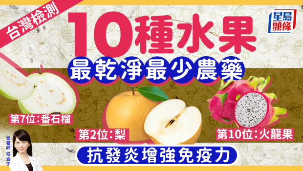吃水果怕誤吃農藥,增加致癌風險?臺灣“農業部”近日公布最新檢測報告,有10款水果殘留農藥最少,包括梨、火龍果、番石榴。有營養師指,這些水果有助抗發炎、增強免疫力。其中3種“最干凈”的水果,更有防便秘、護眼、通血管等功效。