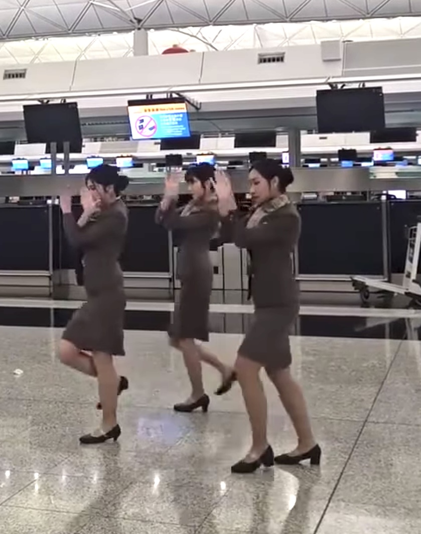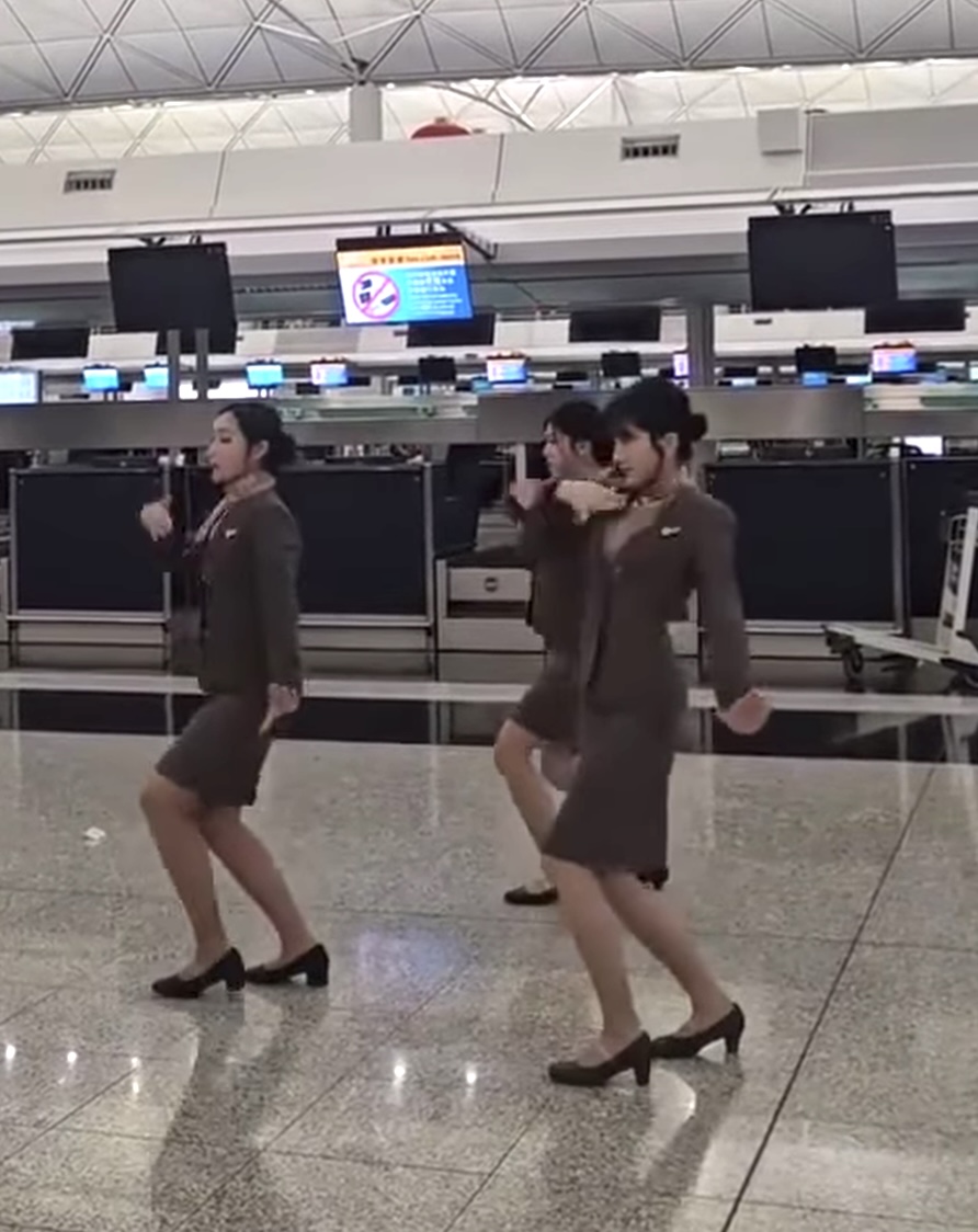 據網民于網上專頁分享的短片所見,有3位韓亞航空(韓亞)的空姐于香港機場離境大堂柜位前拍攝跳舞片段,引起網民熱烈關注。片中的空姐即使身穿制服,身體動作仍然非常靈活,複雜的舞步也難不到她們,動作利落有力,而且練習得非常整齊,實在令人覺得她們是被“被空姐耽誤的舞蹈員”。其實,除了機場內的片段,韓亞的空姐與空少亦有到香港其他景點,如天壇大佛、昂坪360等地跳舞表演,似乎是希望向海外旅客宣傳香港的景點。