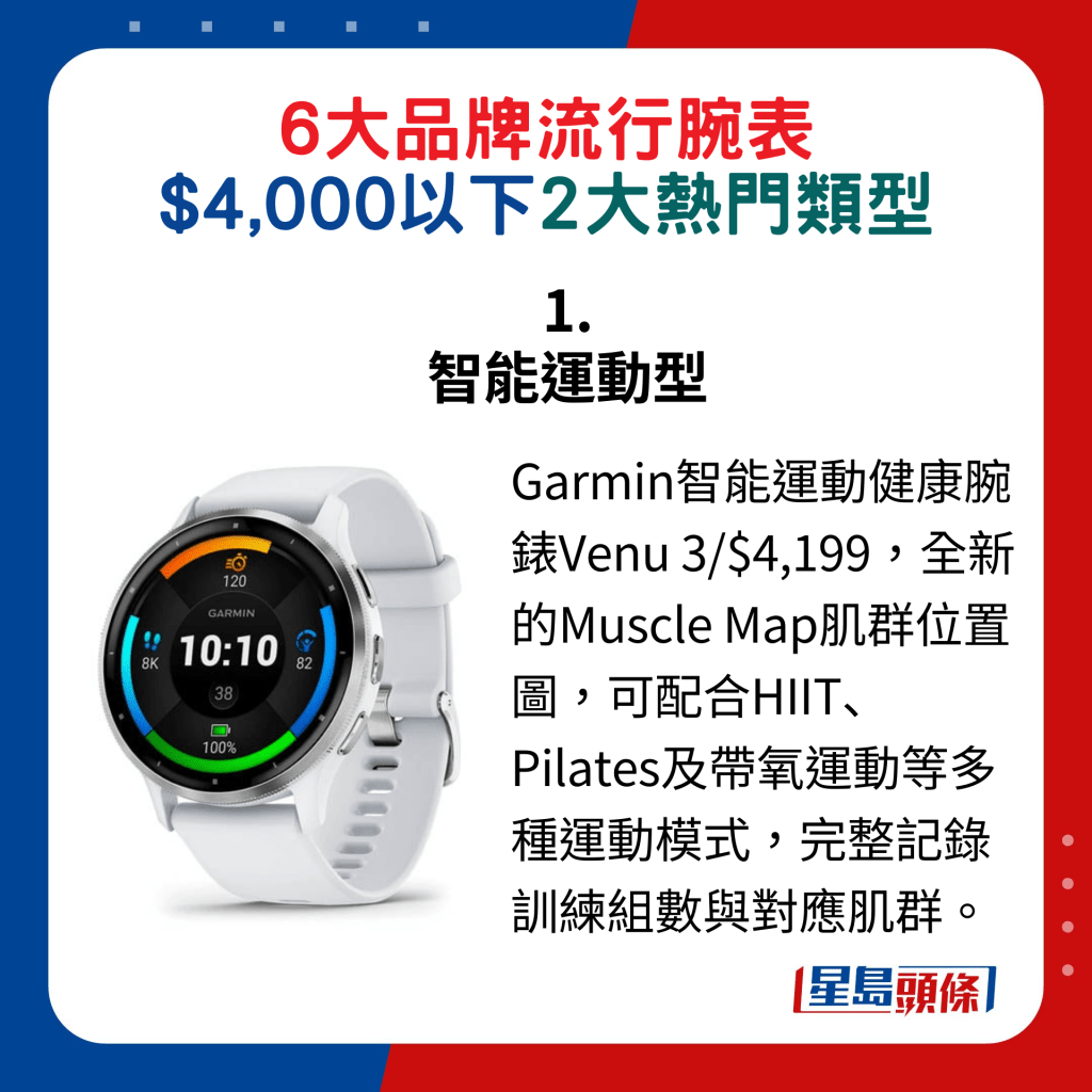 智能運動腕表當然針對運動效能而設,所以選購時要多加留意耗電量及充電時間,還需要考慮自己平日的運動習慣及需要。人氣品牌Garmin繼早前為跑步系列Forerunner增推新型號后,最近Venu及VíVOACTIVE系列亦有新一代版本登場,前者結合健康監測及健身功能,除了具備冥想指南及呼吸訓練功能,有助引導冥想及呼吸練習外,其Muscle Map肌群位置圖亦可配合HIIT、普拉提(Pilates)及帶氧運動等模式,記錄每次練習的組數和對應的肌群分布。至于VíVOACTIVE的第5代新版本則改用鋁制金屬制作,可支持超過30種運動模式,最特別是可替輪椅用家設計的鍛煉計劃。