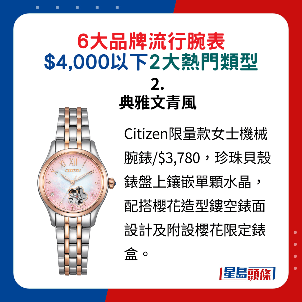 Fashion Watch是造型配襯恩物,外形簡潔的設計,更添一份文青格調。Daniel Wellington腕表一向主打簡約設計,女裝表新作用上羅馬數字表盤配搭藍鋼指針,清新又帶點復古韻味。另日牌Citizen的全新限量版女士機械腕表,將櫻花融入設計之中,表面的鏤空櫻花圖案,配搭珍珠貝殼表盤,優雅別致。