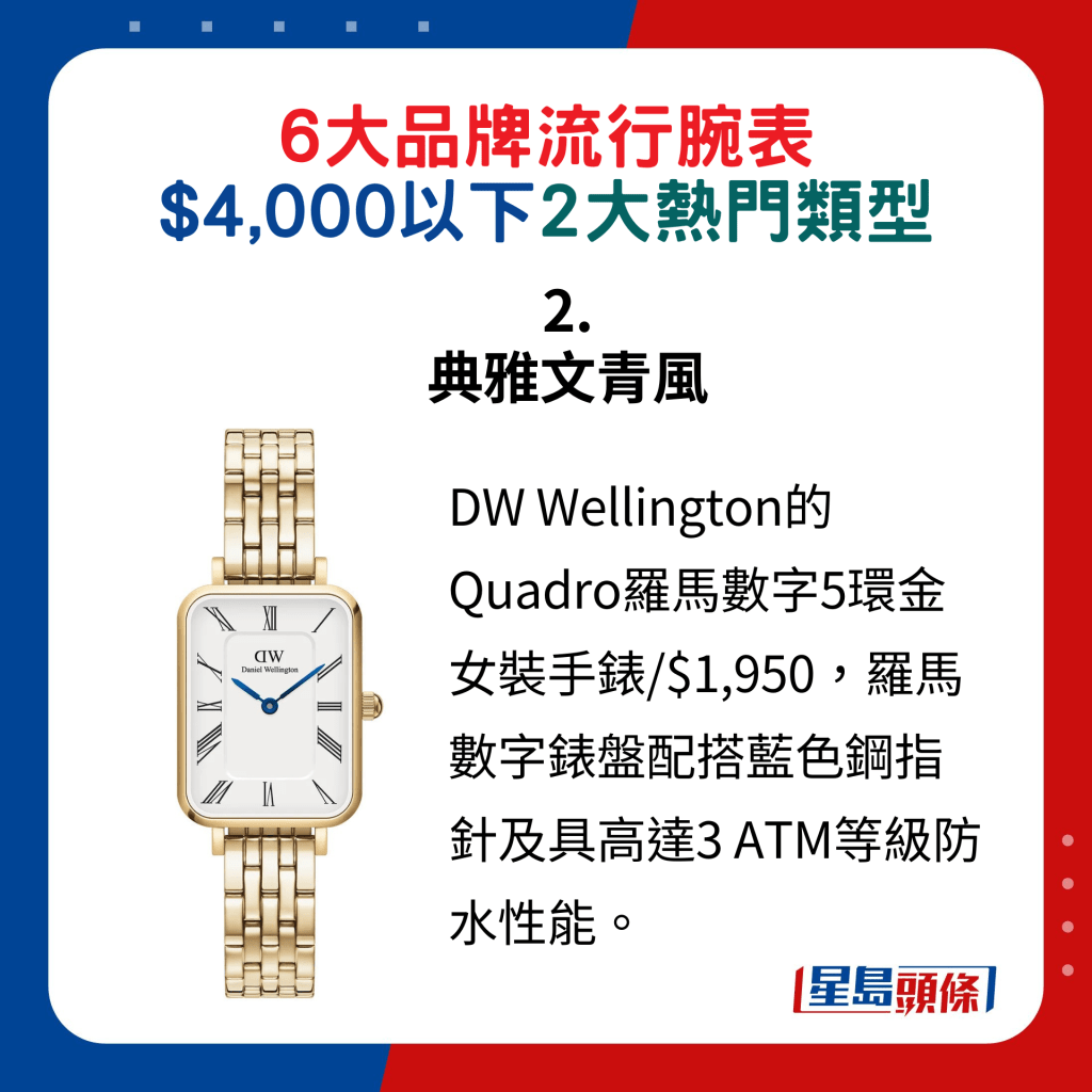▲DW Wellington的Quadro羅馬數字5環金女裝手表/$1,950,羅馬數字表盤配搭藍色鋼指針及具高達3 ATM等級防水性能。