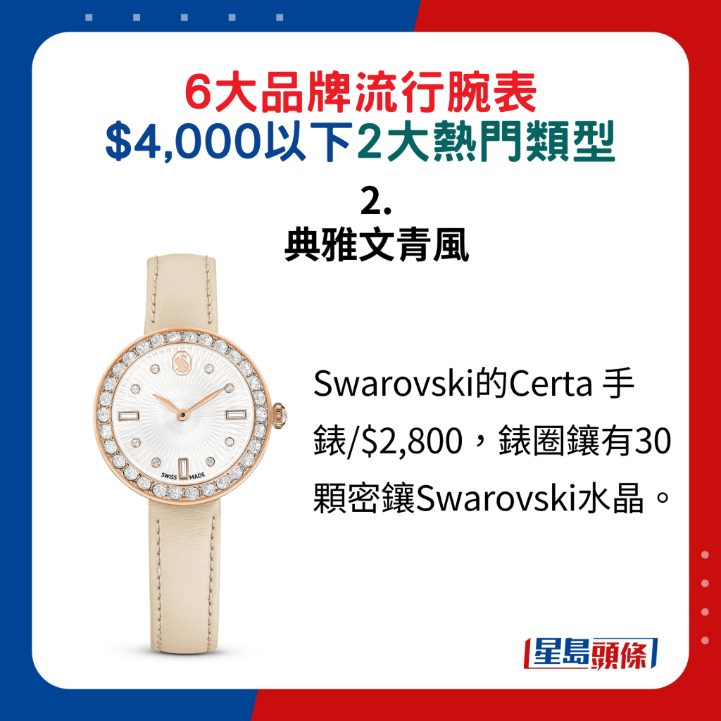 Swarovski既以水晶為賣點,腕表當然也以標志性的水晶裝飾,如表圈密鑲30顆水晶的Certa新作,亦用上機刻雕花表盤,刻度鑲嵌圓形及長方形切割水晶,都不用$3,000便有交易,單買精致鑲工已值回票價。品牌另一款Dextera Bangle腕表就采用對稱設計的八角形表殼,配以鑲嵌92顆品牌水晶的表圈,展現幾何美學。