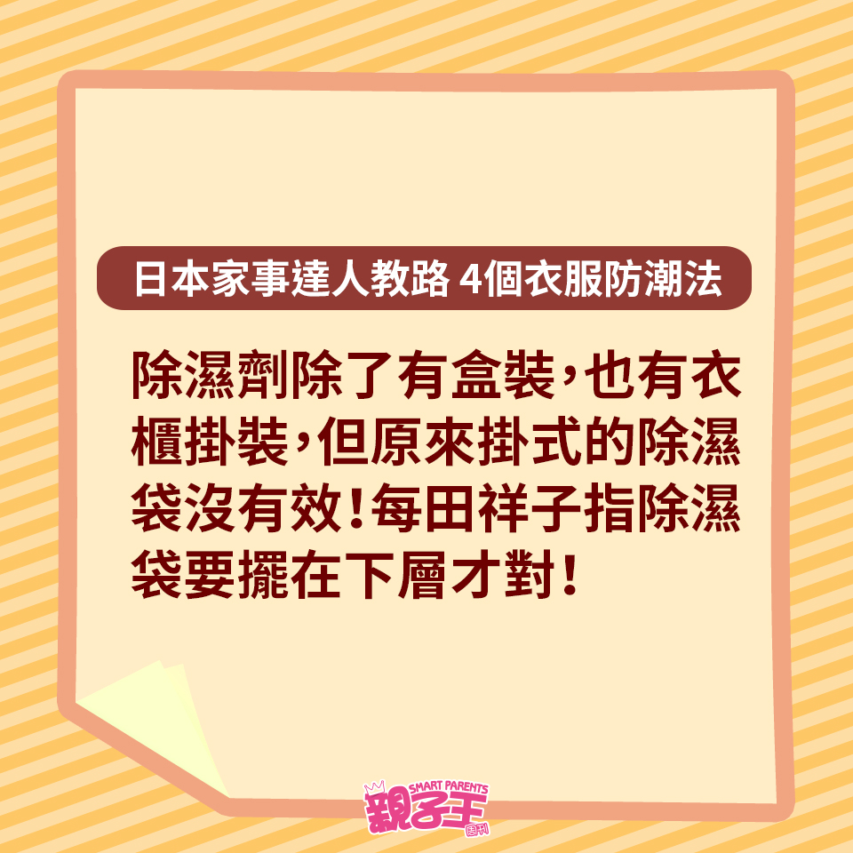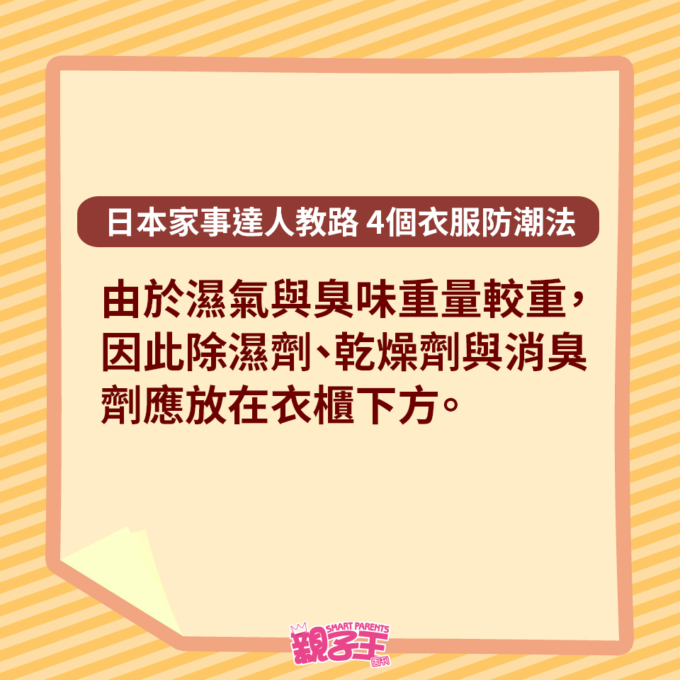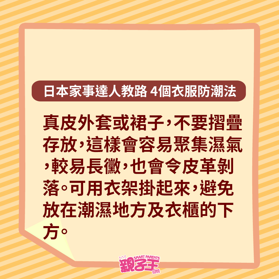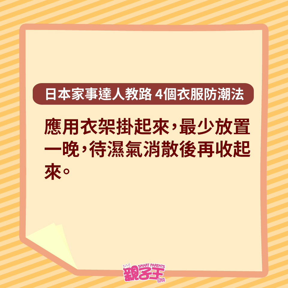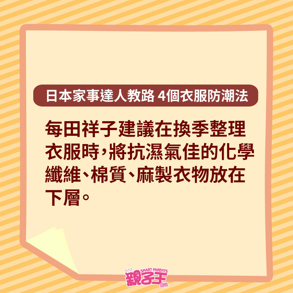 回南天除了晾衫困擾媽媽們,如果衣服收藏不當,衣柜或柜子更會有陣霉味。不想衣服出現霉菌黑點,日本家事達人每田祥子就教大家用以下4個方法收藏衣服,便有效趕走濕氣,更有助對付臭味及發霉元兇。