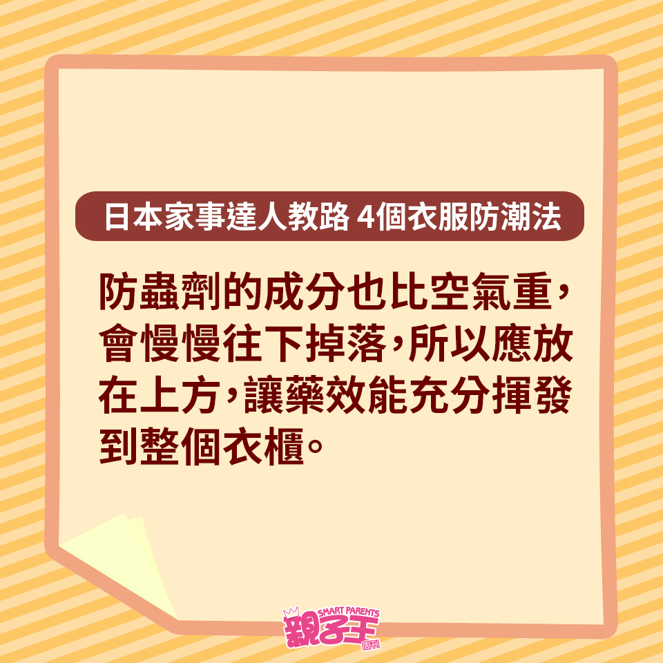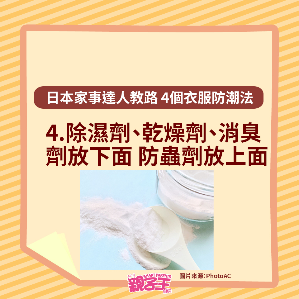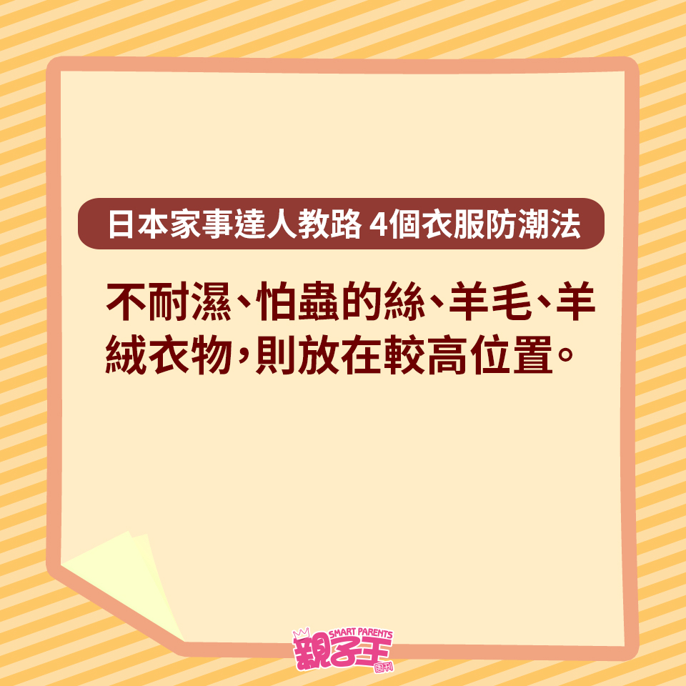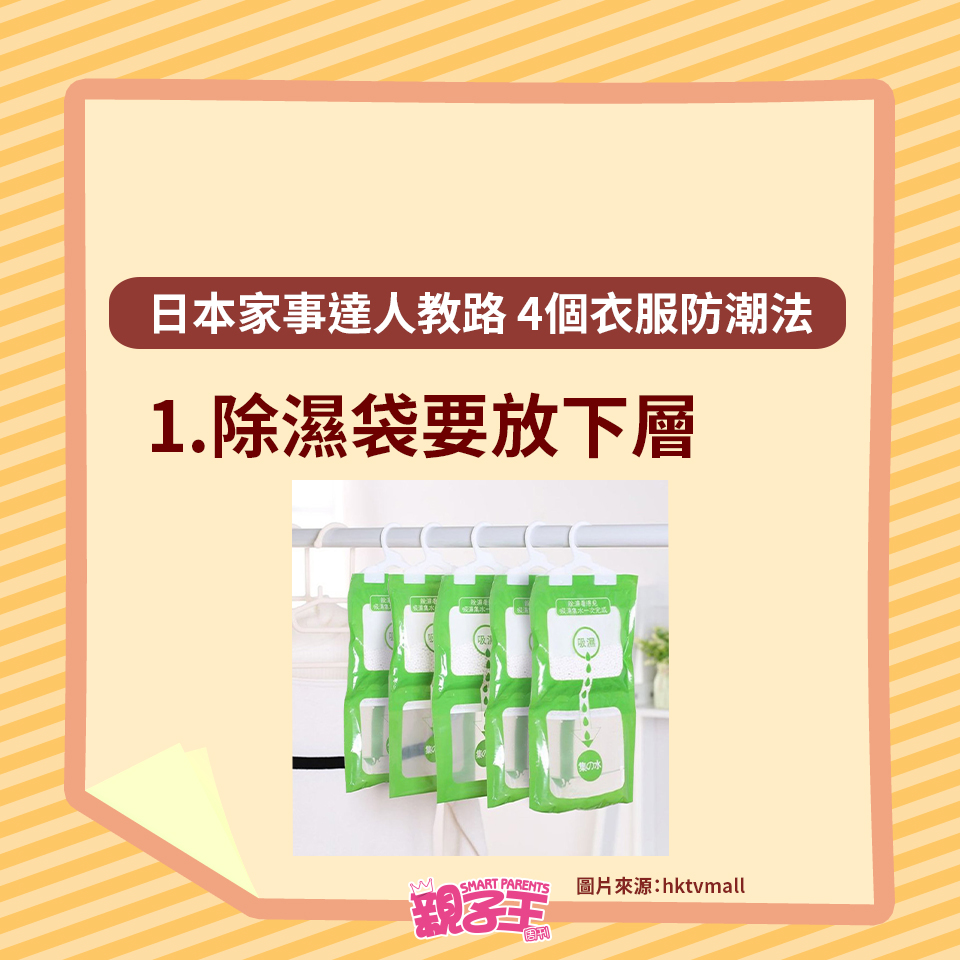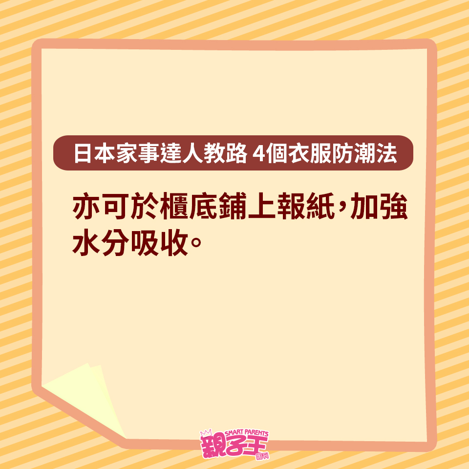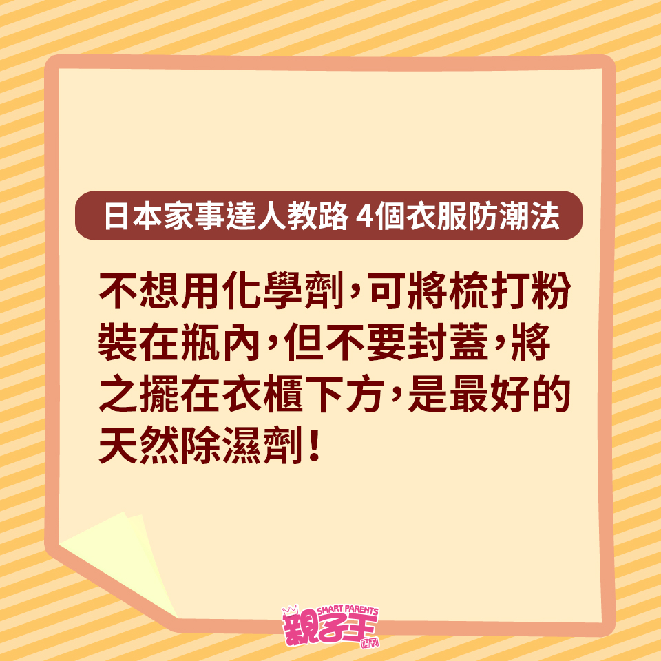 回南天除了晾衫困擾媽媽們,如果衣服收藏不當,衣柜或柜子更會有陣霉味。不想衣服出現霉菌黑點,日本家事達人每田祥子就教大家用以下4個方法收藏衣服,便有效趕走濕氣,更有助對付臭味及發霉元兇。
