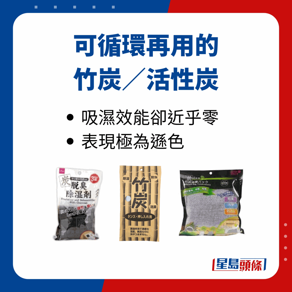 硅膠防潮珠及竹炭/活性炭家用吸濕劑表現更差,硅膠防潮珠樣本于14天測試后,吸濕度就接近飽和,使用時間較短; 3款竹炭/活性炭家用吸濕劑的累積吸濕量更只有0.33-1.44毫升,吸濕度近乎零。
