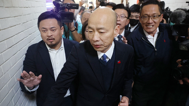 ▲“立法院”15日院會發生“立委”質詢唱名未到提前休息風波,民進黨“立委”洪申翰(左)等人前往院長室向院長韓國瑜(中)抗議。
