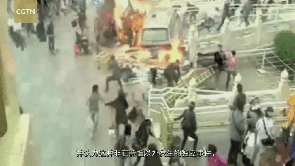 ▲吉普車撞向了天安門城樓前金水橋的護欄后起火。 中國環球電視網截圖