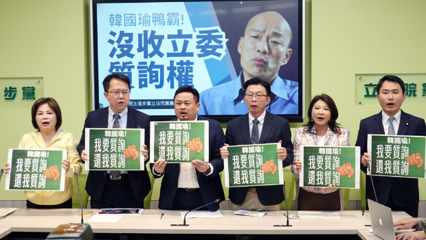 ▲“立法院”15日院會發生“立委”質詢唱名未到提前休息風波,民進黨“立委”賴惠員(左起)、邱志偉、洪申翰、郭國文、林楚茵、陳冠廷舉行記者會,抗議“立法院長”韓國瑜沒收“立委”質詢權。中時資料照