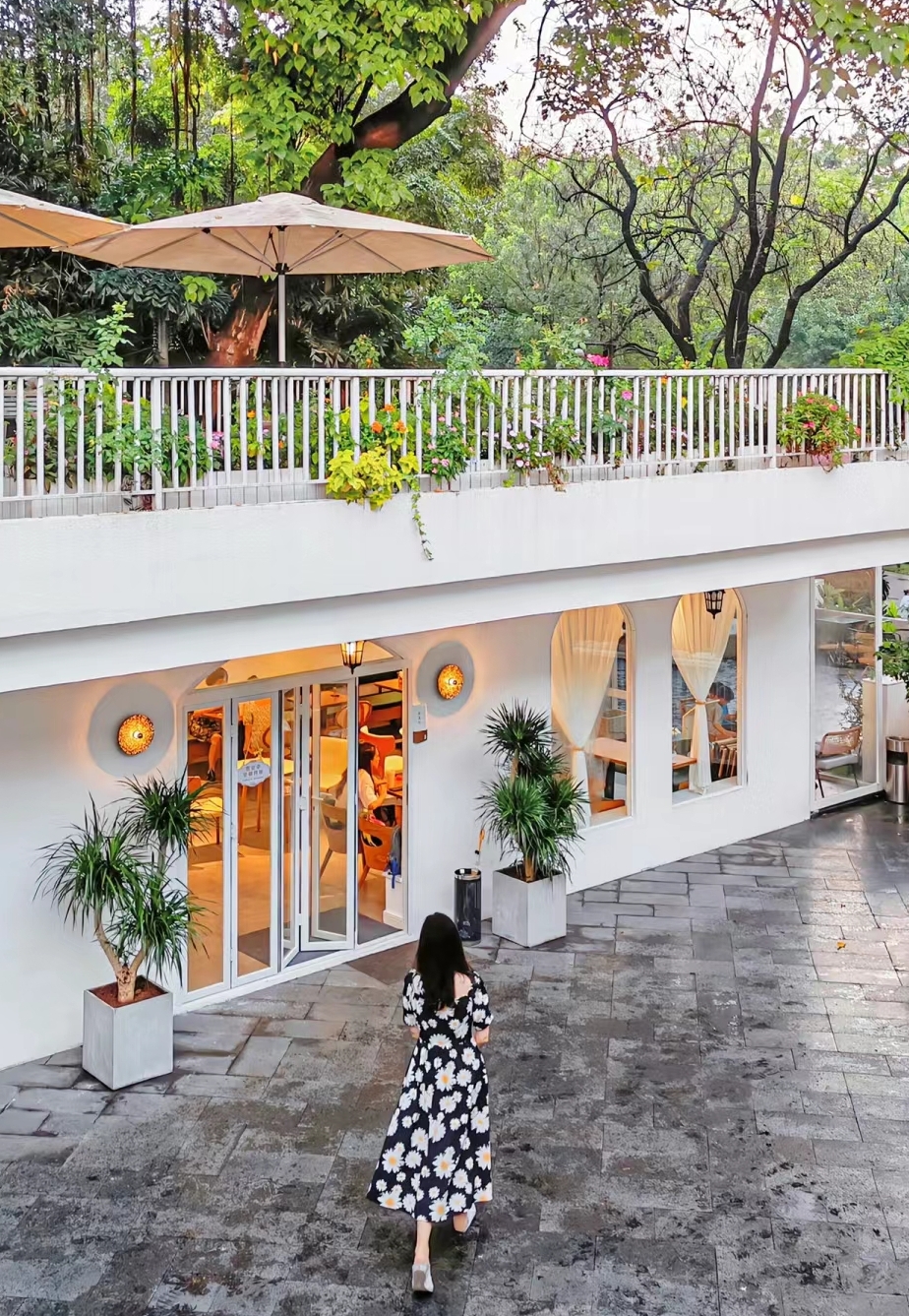 廣州花城里.陌上花開位于越秀公園東秀湖畔,與繁花相擁,開業兩年,因其浪漫湖邊小白屋美景,迅即成為網紅打卡好去處。獨棟小屋樓高兩層,下層是書店和咖啡室,有包廂可以舉行生日會。進門就是廣州唯一開在公園的新華書店,有機器供查找圖書目錄,書本種類有文青至愛的歐洲文學、日本文學、當代小說、散文等??Х仁曳譃椤皬凸艜w”和“陽光玻璃房”兩個區域,供應西餐,美食有沙律、意粉、扒類、pizza薄餅、小食、甜品、咖啡、奶茶、水果茶等,必吃英式下午茶,High Tea打卡可以玩上一個下午。上層是會議室和戶外露臺,綠樹圍繞,感覺自然清新。