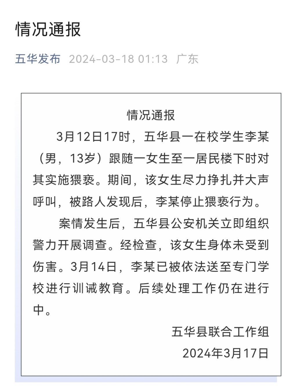 至昨日深夜,伍華縣聯合工作組發通報,指事件發生在12日下午5時,一名13歲在校學生李某,尾隨一名女生至一居民樓下實施猥褻,后被路人發現,李某始停手。