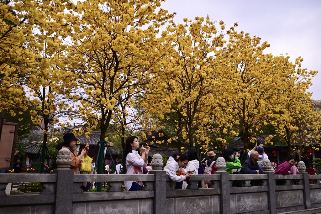 ▲近日光孝寺有一大片黃花風鈴木正在燦爛盛放。
