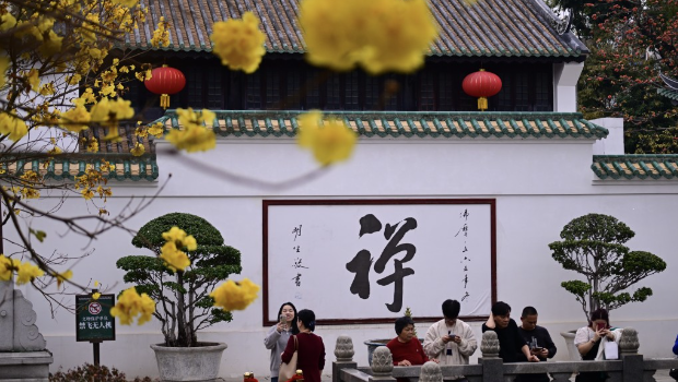 光孝寺是廣州歷史最悠久的寺院建筑,近日寺內有一大片黃花風鈴木正在燦爛盛放。蓮池旁種有兩排、共10多棵風鈴木,踏入3月花期,滿樹串串如風鈴的黃色花朵,開得十分密集,化身成為黃金小路,加上古色古香的寺院建筑作背景,顯得份外莊嚴美麗。佛教中有“借花供佛”之意,大家不妨前來賞花參禪,欣賞金黃花海。