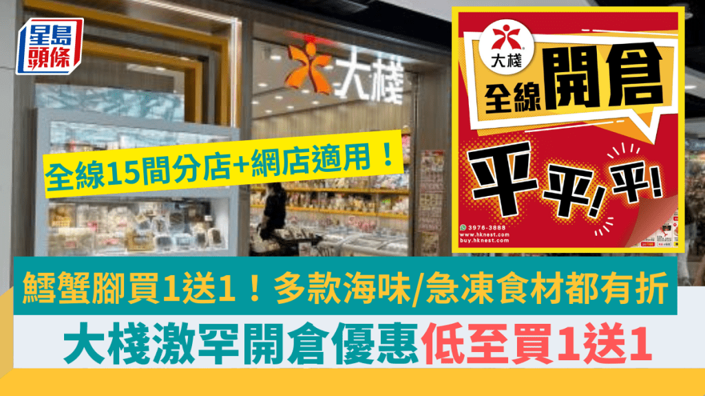 由即日起至3月31日,大棧舉行10年以來首次開倉清貨優惠,多款人氣產品都有減價,全線15間分店適用,其中門市限定優惠包括1,000克丹麥野生熟鱈蟹腳買1送1(原價$399)、珍寶刺身級野生真鯛買一送一(原價$199)、法國無激素雞翼$100/4磅(原價$200)及美國急凍鮮海參$399/4磅(原價$516)等;此外,場內多款罕有花膠額外95折,而日本特級關西參及日本舊水吉品鮑亦有額外9折等。