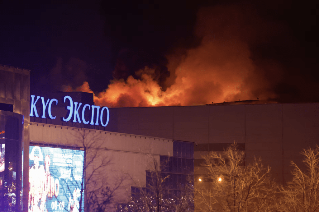 多名身穿迷彩服的人在克洛庫斯市政廳開槍,路透社取得的影片顯示,大廳內冒出大火并冒出濃煙,警方正在現場,指槍手在大樓內放火。