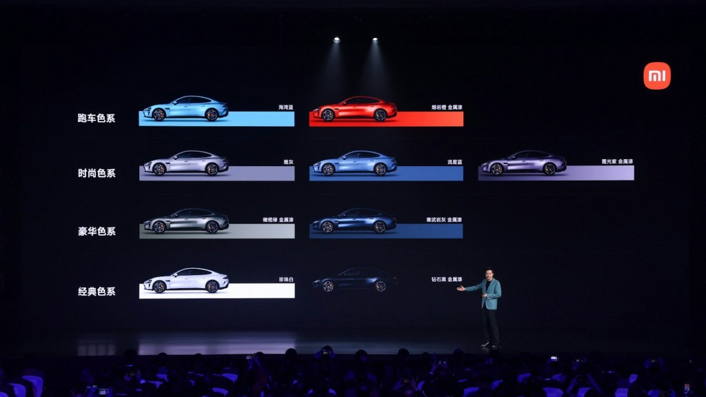 ▲除了去年底技術發布會已經發布的三款車身顏色,雷軍現場加碼推出6款全新顏色,合計小米汽車SU7將總共推出9款車身、4款內飾顏色。