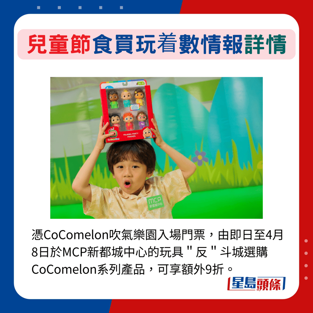 ▲憑CoComelon吹氣樂園入場門票,由即日至4月8日于MCP新都城中心的玩具"反"斗城選購CoComelon系列產品,可享額外9折。
