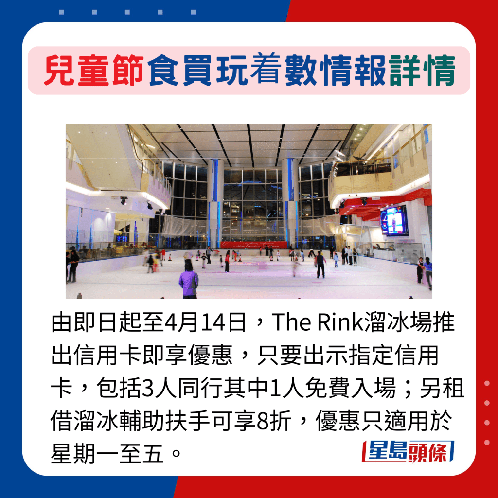 ▲由即日起至4月14日,The Rink溜冰場推出信用卡即享優惠,只要出示指定信用卡,包括3人同行其中1人免費入場;另租借溜冰輔助扶手可享8折,優惠只適用于星期一至五。