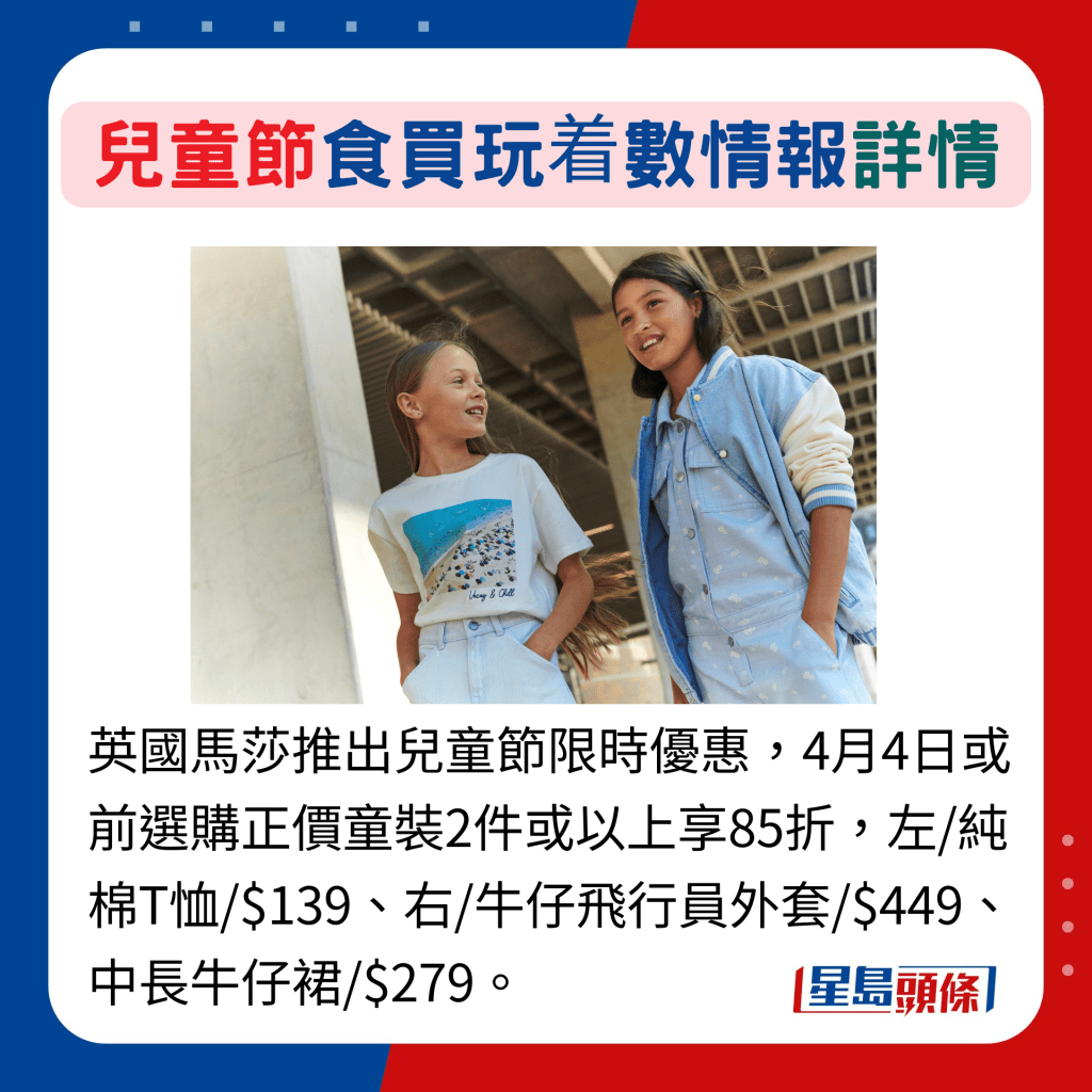▲英國馬莎推出兒童節限時優惠,4月4日或前選購正價童裝2件或以上享85折,純棉T恤/$139、牛仔飛行員外套/$449、中長牛仔裙/$279。