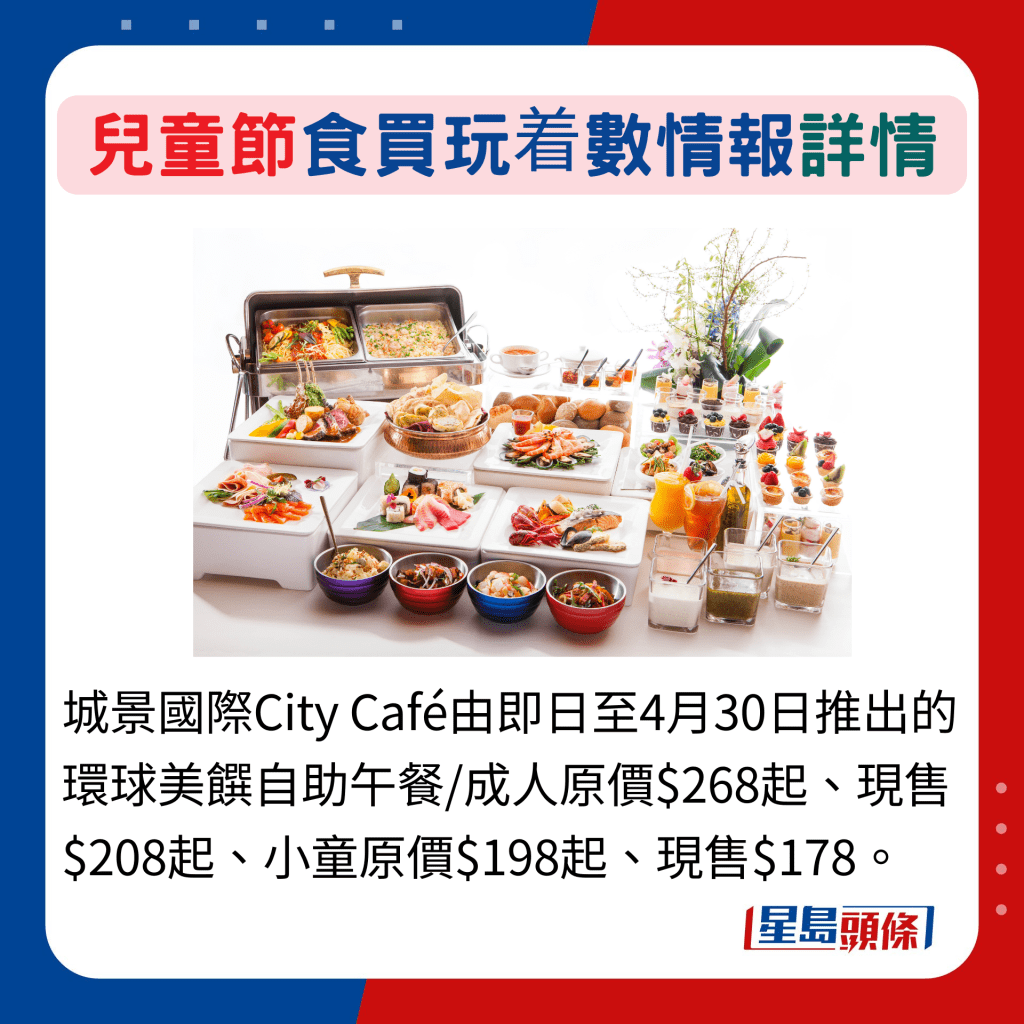 ▲城景國際City Café由即日至4月30日推出的環球美饌自助午餐/成人原價$268起、現售$208起、小童原價$198起、現售$178。