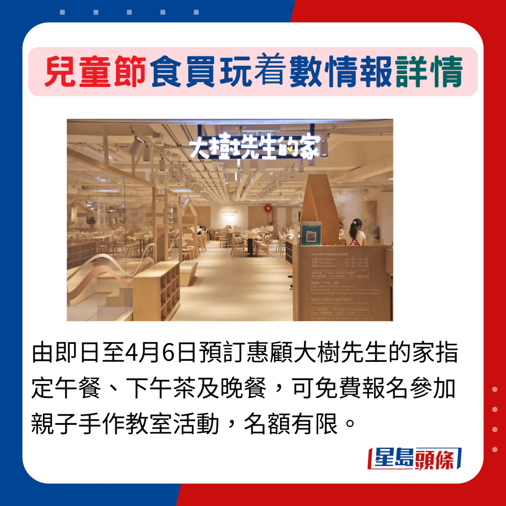 ▲由即日至4月6日預訂惠顧大樹先生的家指定午餐、下午茶及晚餐,可免費報名參加親子手作教室活動,名額有限。