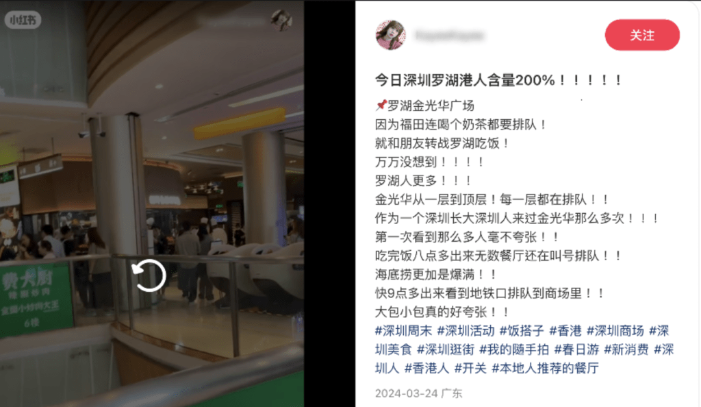 有深圳居民在內地社交平臺小紅書分享短片,大字標題“今日深圳羅湖港人含量200%”,畫面可見商場內到處都是排隊等位的人流。事主表示自己是深圳人,原本想去福田,但發現“連喝個奶茶都要排隊”,于是轉戰羅湖商場金光華廣場。怎料到場后發現人流更墟冚,從一層到頂層,每一層都在排隊。她大嘆“以深圳長大深圳人來過金光華那么多次! 第一次看到那么多人毫不夸張! ”,更表示餐廳全都滿座,“海底撈更加是爆滿 !快9點多出來看到地鐵口排隊到商場!”,對如此 洶涌人潮大感震驚。