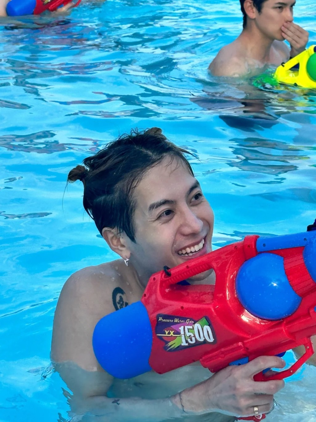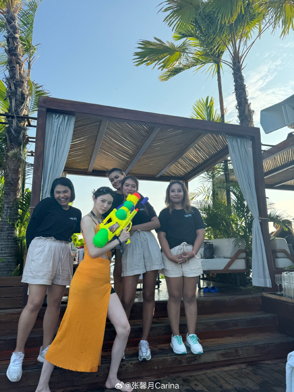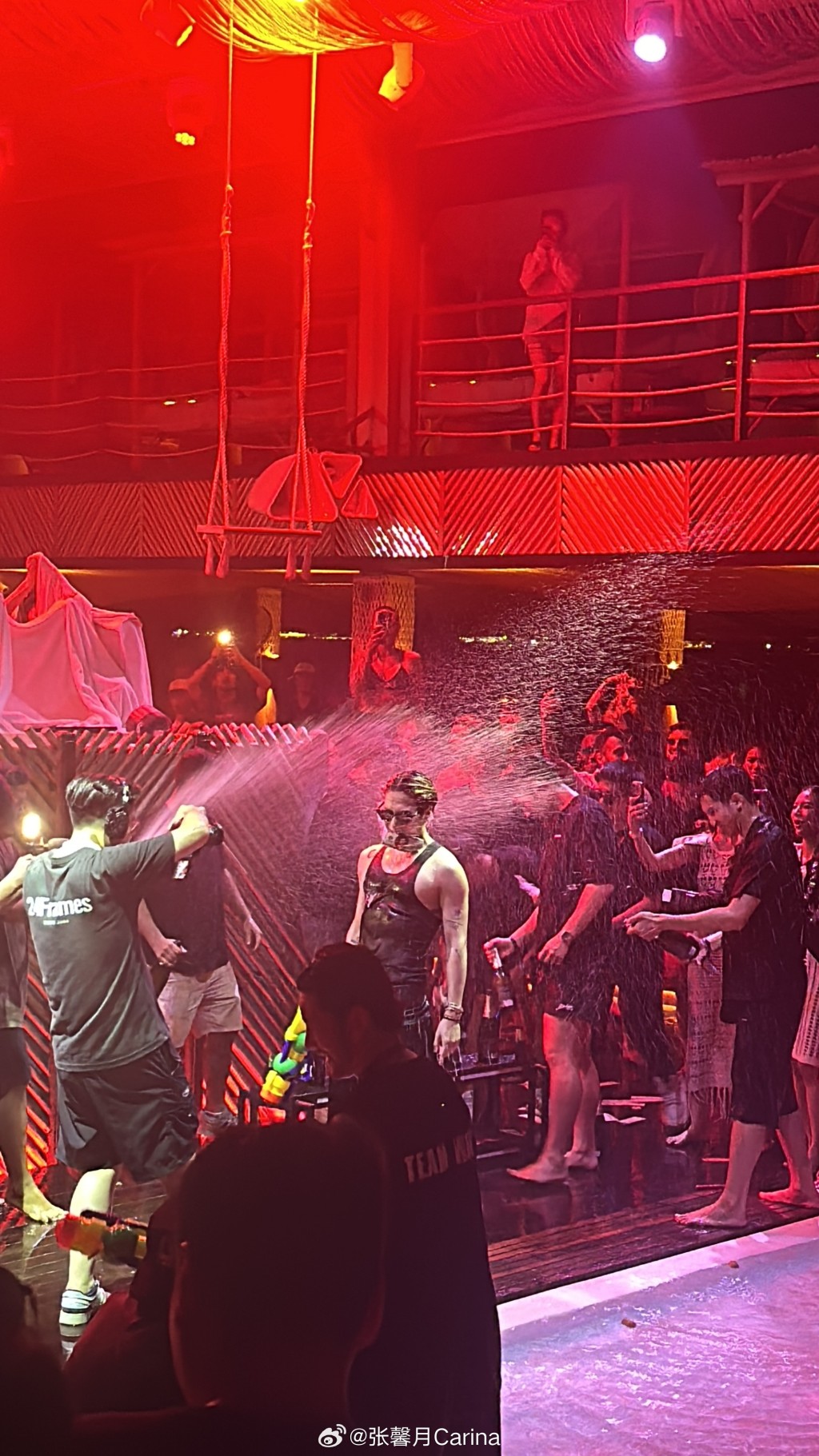 張馨月近日在多個不同社交網分享多輯照片,只見她穿上一件橙色吊帶上衣,露出一條小纖腰,下身雖然穿上同款同色長裙,但露出一邊白滑長腿,非常吸睛。這位人妻更于泳池邊玩水槍,而在泳池中同樣手持水槍的,則是韓國男團GOT7成員王嘉爾,之后張馨月更曬出兩人頭貼頭的合照,陳敏之見到兩人的合照都留言指好羨慕,而張馨月則回覆回來再聚。此外,當一艘寫上“HBD JACKSON”的游艇駛近時,張馨月更大派心心。原來這輯照片是早前王嘉爾在28日慶祝30歲生日,在布吉大開派對所拍。