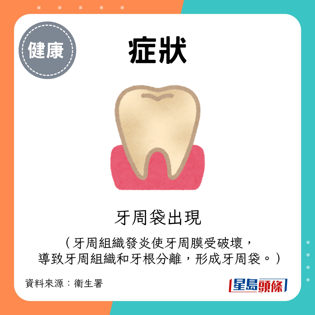 牙周袋出現(牙周組織發炎使牙周膜受破壞,導致牙周組織和牙根分離,形成牙周袋。 )
