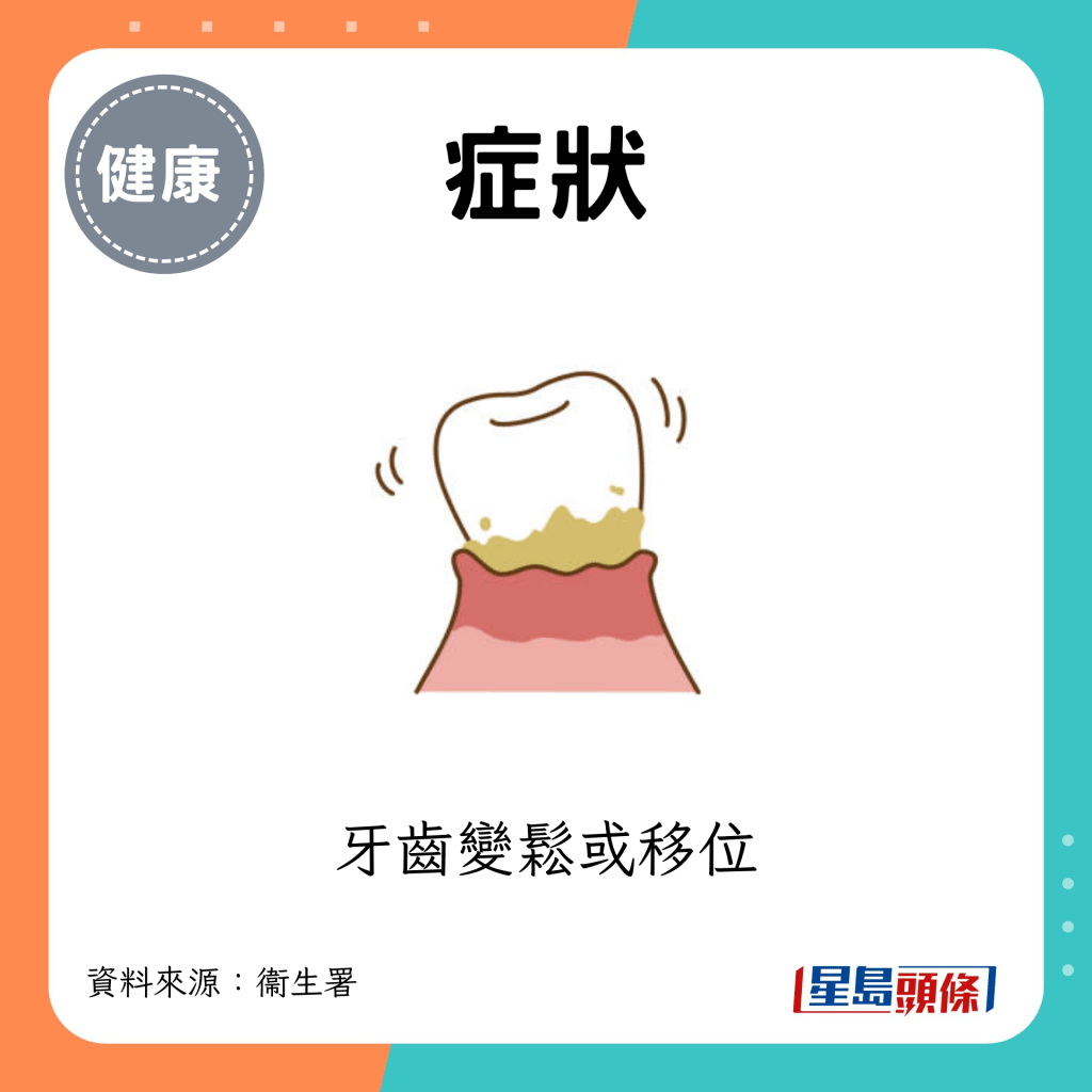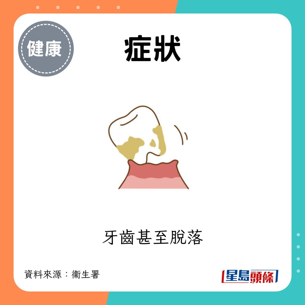 如果牙菌膜積聚,牙齦邊緣會出現發炎征狀,造成輕微牙周?。囱例l炎)。 若身體抵抗力下降,身體組織愈合能力欠佳,牙周組織包括牙齦、牙周膜和牙槽骨等就會遭受破壞,情況就會惡化,形成嚴重牙周?。囱乐苎祝?。
