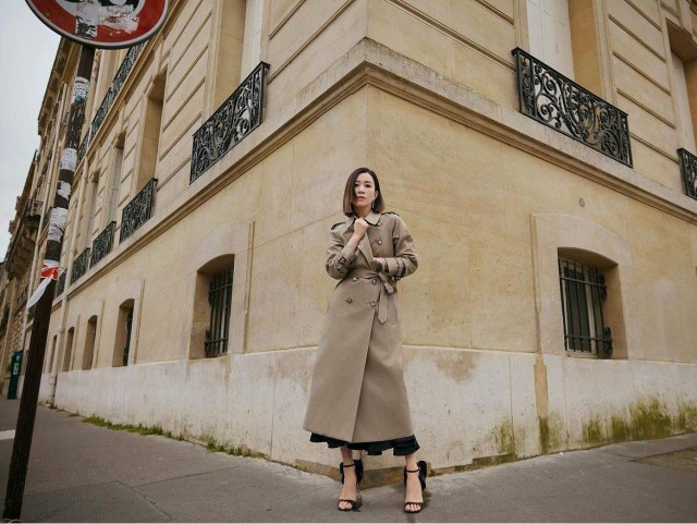 ▲視后佘詩曼以Trench Coat配搭裙裝與高跟涼鞋,造型剛柔兼備。(圖片來源:IG@charmaine_sheh)