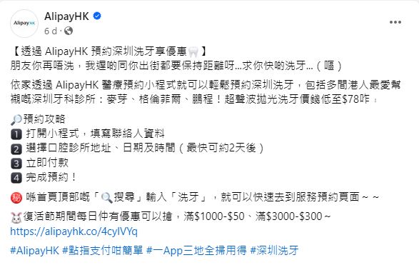 ▲AlipayHK的facebook專頁發帖,指用AlipayHK 醫療預約小程式預約深圳洗牙,函蓋的牙科診所包括麥芽、格倫菲爾及鵬程等,其中超聲波拋光洗牙價錢低至$78。