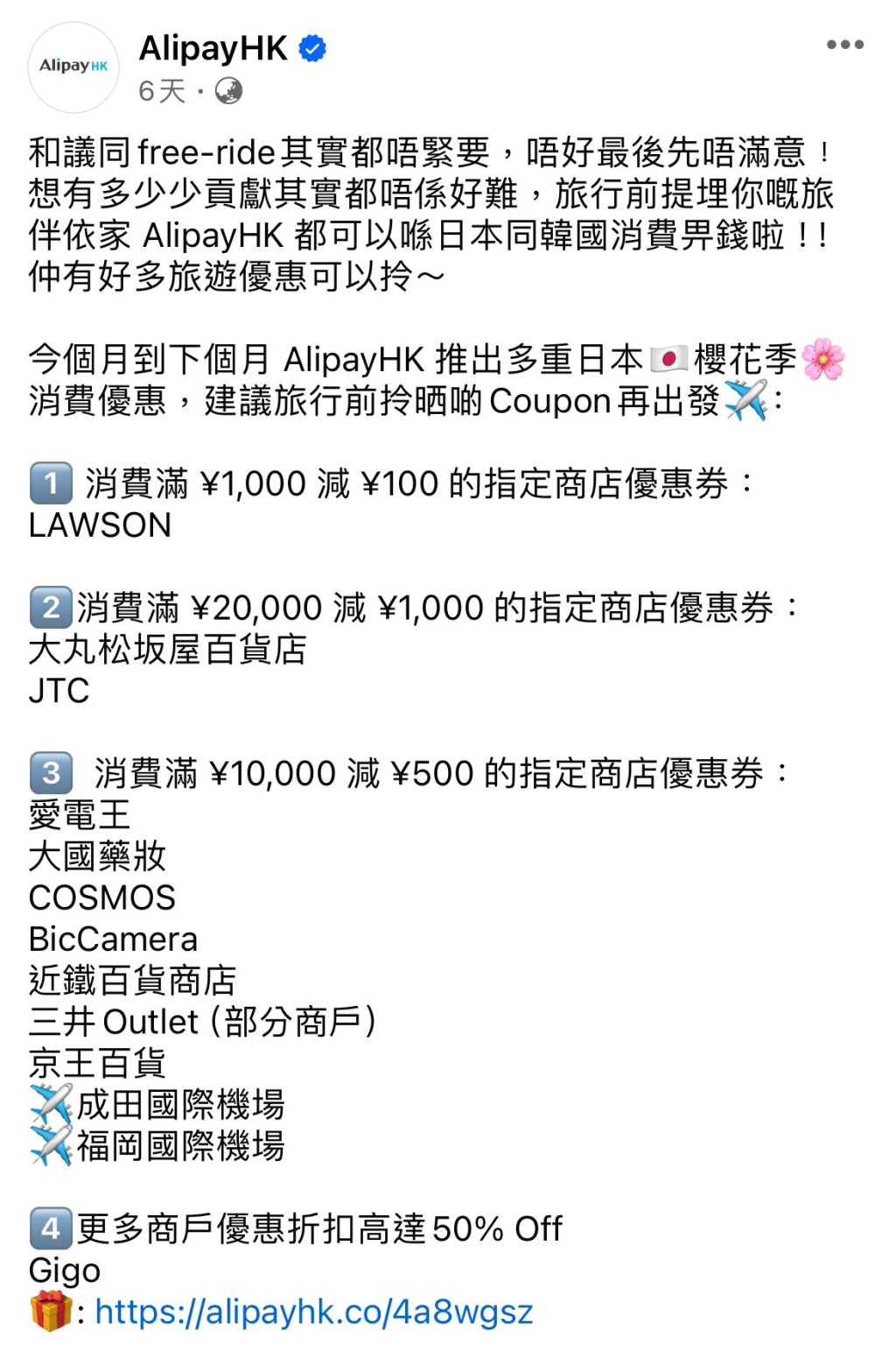 ▲AlipayHK的facebook專頁發帖,推出日本櫻花季4項消費優惠,只要消費滿指定金額即可用優惠券享減價,而優惠券最好出發前領取。