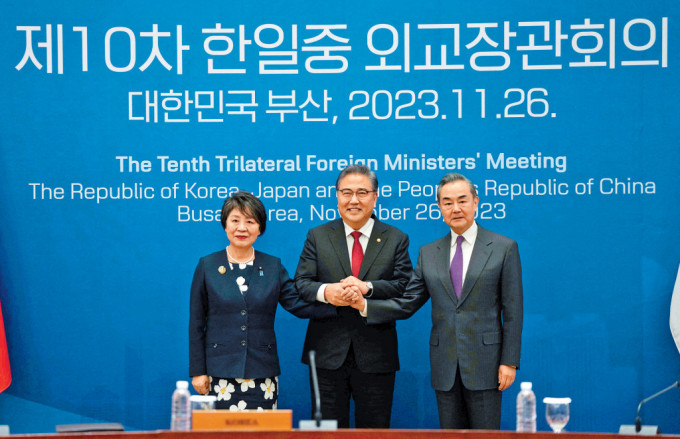 ▲日本外務大臣上川陽子(左)、韓國外長樸振(中)及中國外長王毅(右)。