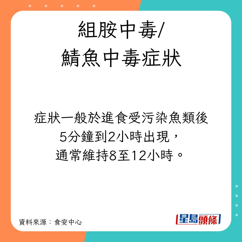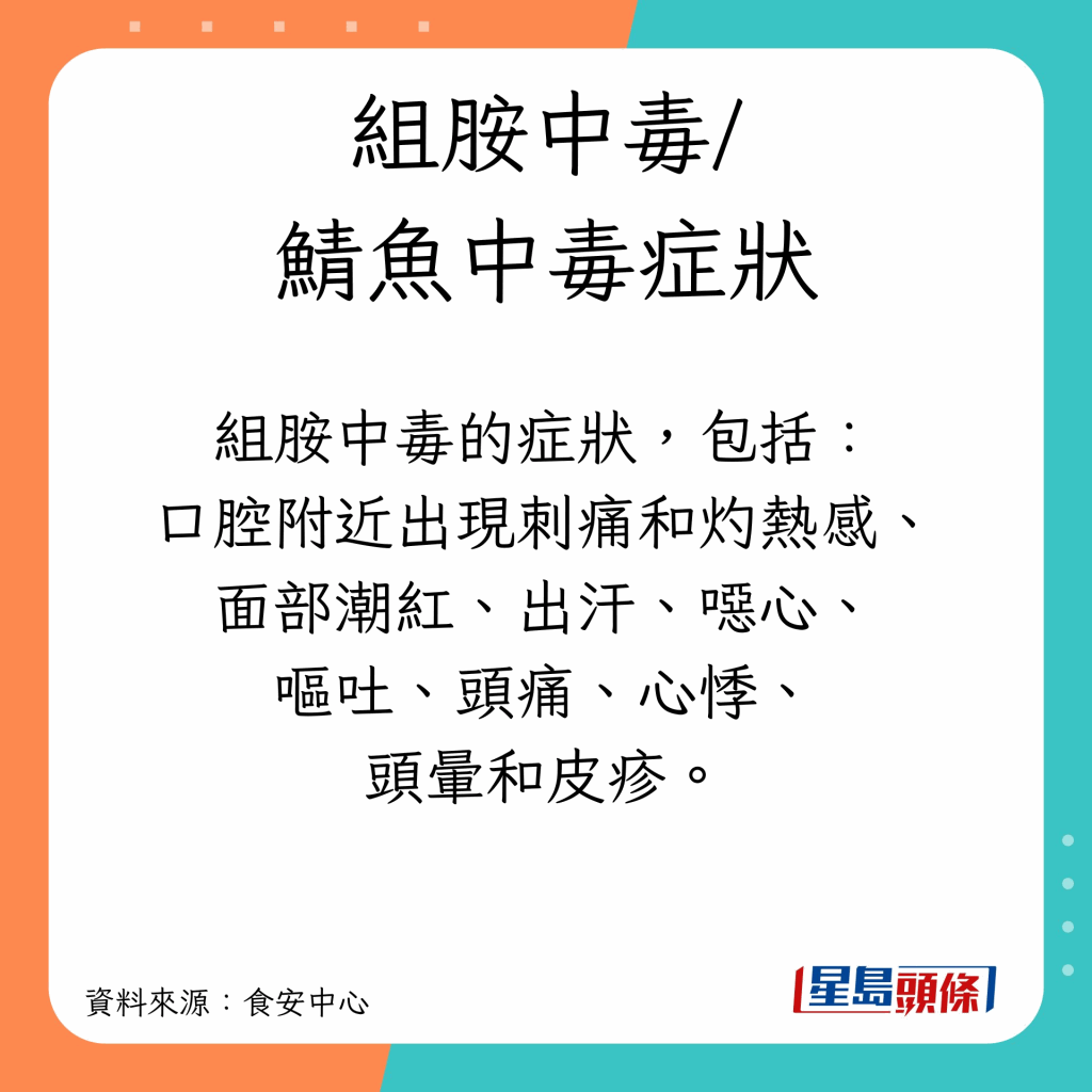 食安中心指,如果進食帶有組胺的魚肉,就可能在半小時內導致組胺中毒,出現以下癥狀: