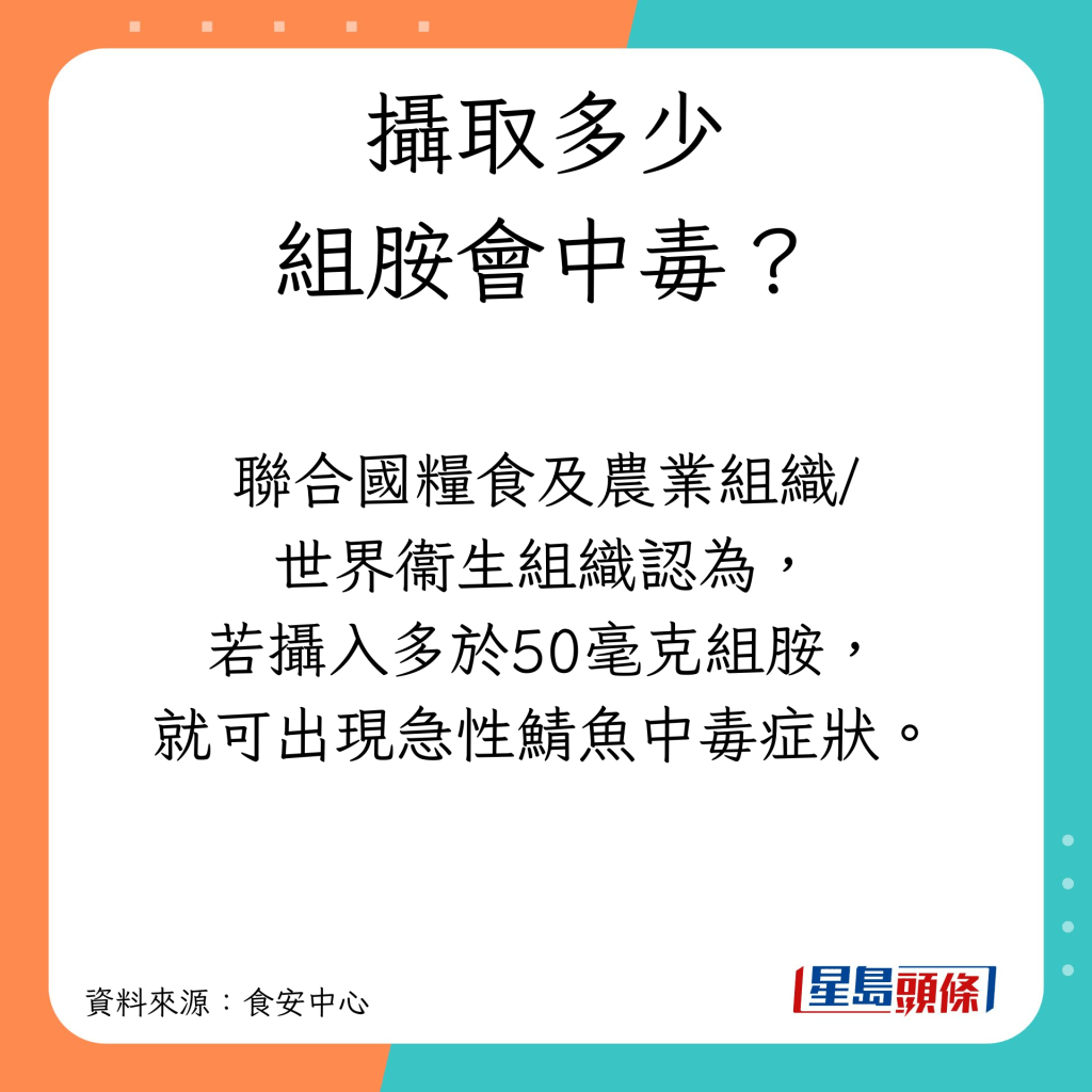 鯖魚、吞拿魚等魚類若處理不當,吃多少會引發組胺中毒?會致命嗎?香港食安中心解釋如下: