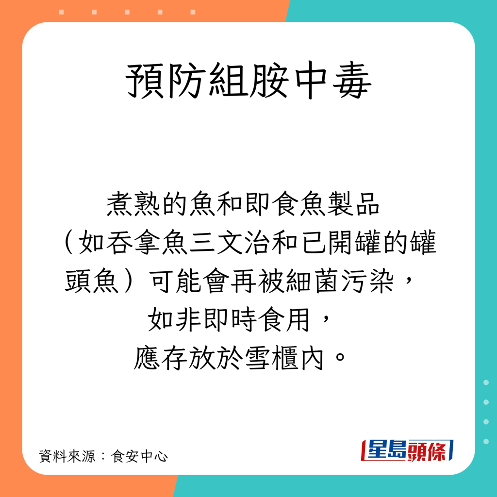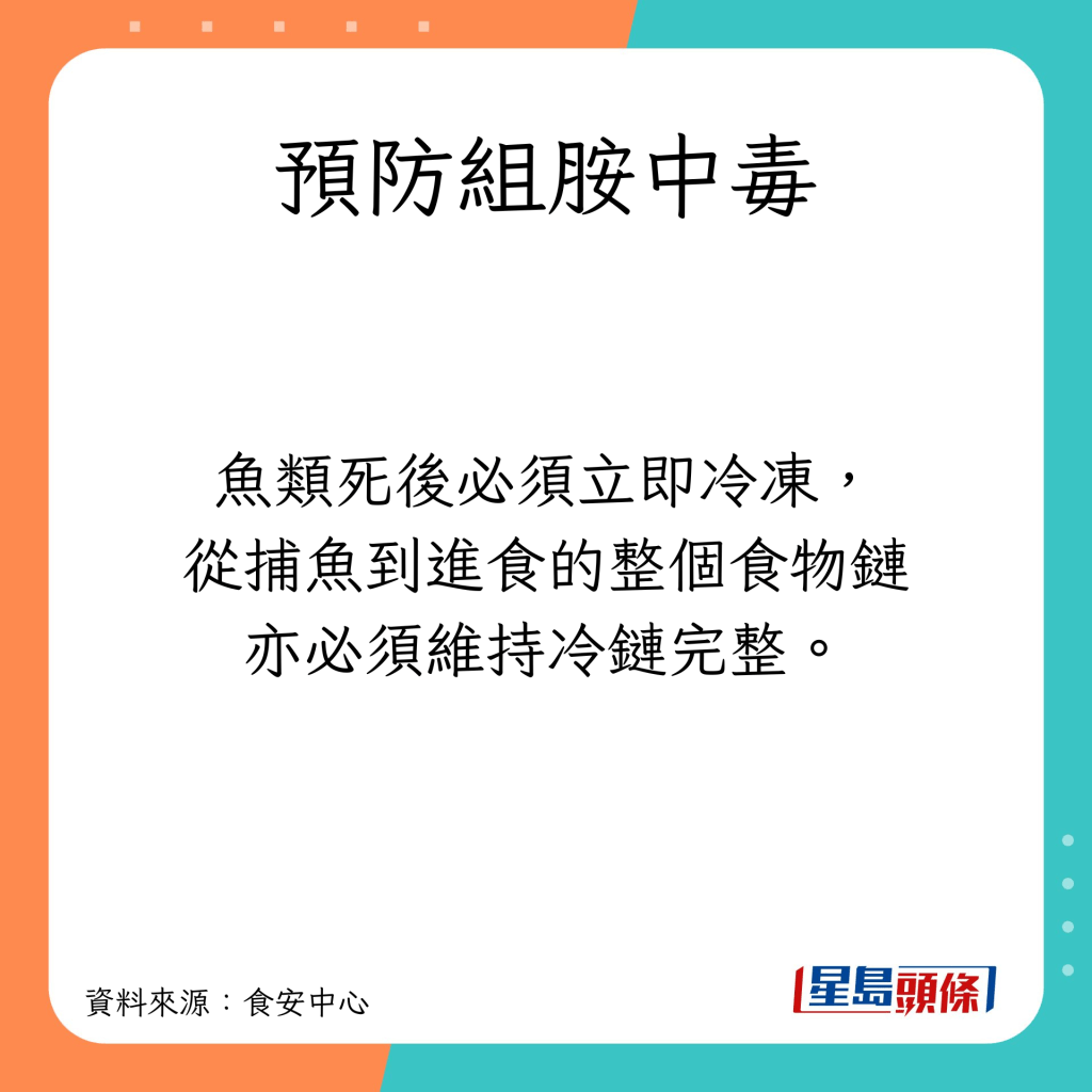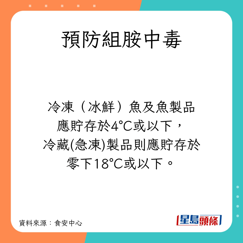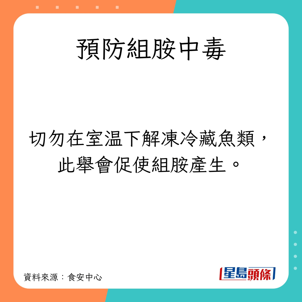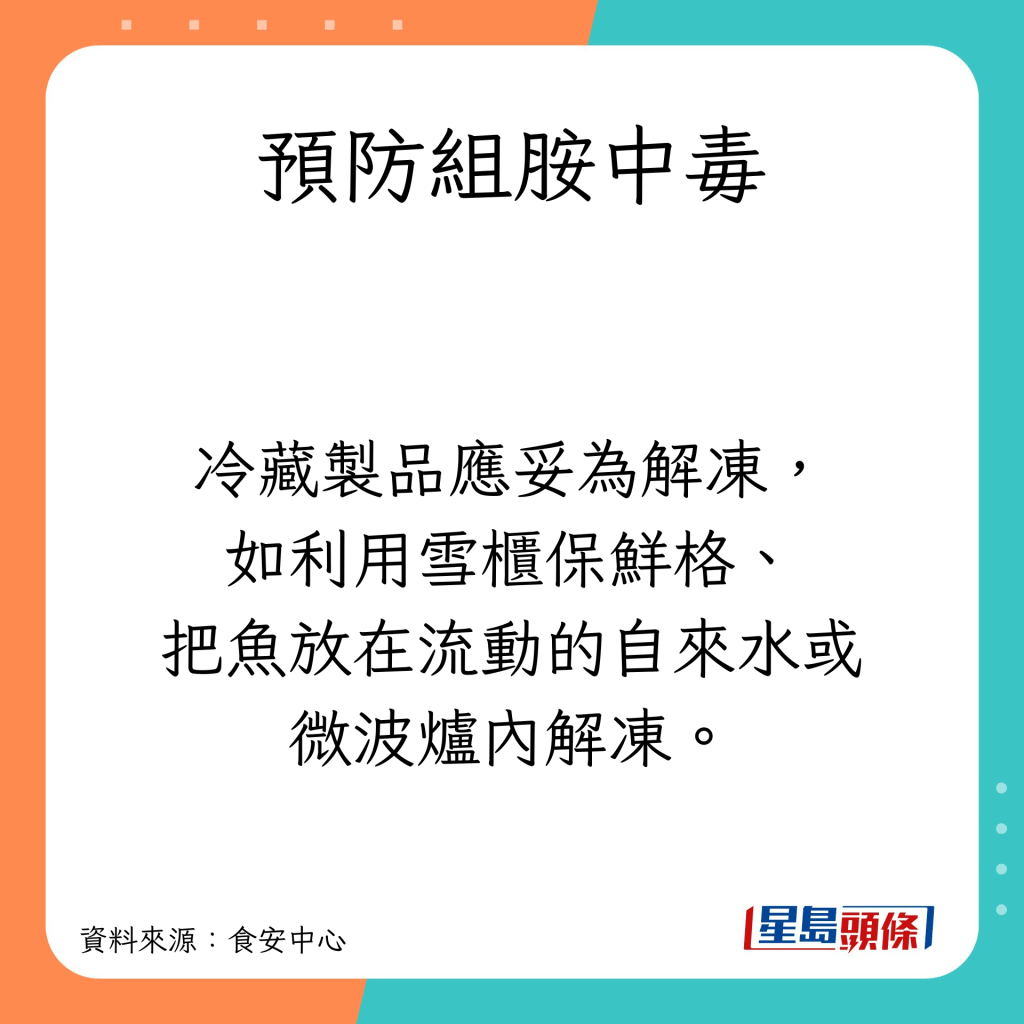 魚及魚制品長時間在不當的溫度下處理及貯存,經過細菌的作用才會令大量的組胺形成。有1種解凍方法很易產生毒素,要預防組胺中毒,食安中心有以下建議: