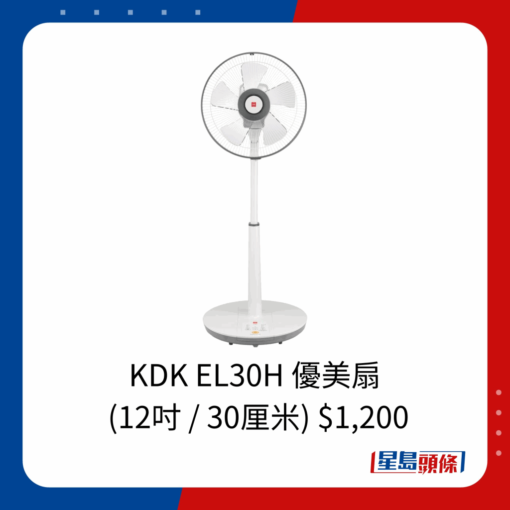 KDK 風扇在網上討論區一直有不少支持者,大贊其風力強勁、夠涼快。KDK 與 Panasonic 屬同一集團,出產的風扇有逾廿多款選擇。最新款“KDK EL30H 優美扇 (12吋 / 30厘米)($1,200)”采用DC 直流馬達,有吹送自然風功能, 7 段風速自由調節。透明塑膠扇葉,長按時間掣3 秒可關閉指示燈。
