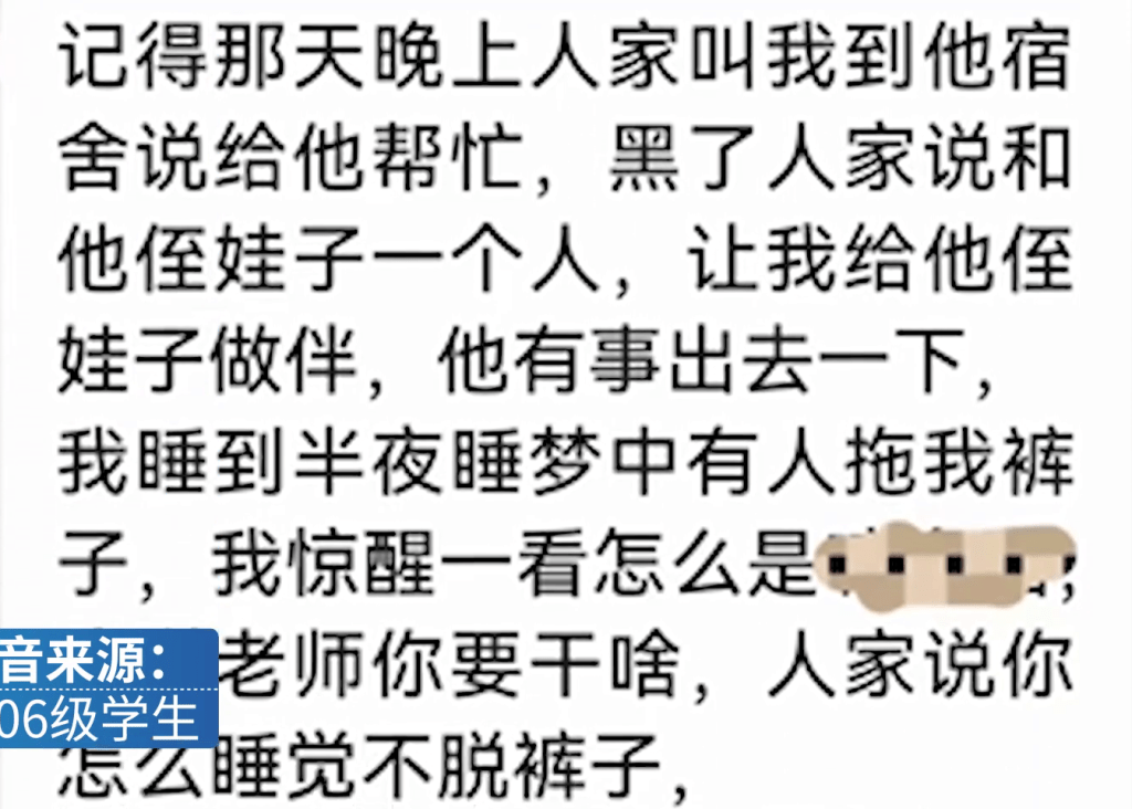 一名2006級左右的學生表示,有朋友曾在馬某某宿舍留宿,有發現跡象但未被侵犯,上學時馬某某喜歡打人。
