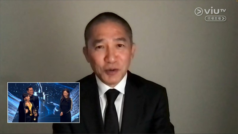 ▲《金手指》梁朝偉奪得第42屆香港電影金像獎最佳男主角,并由太太劉嘉玲代領,梁朝偉透過視像通話講感言。