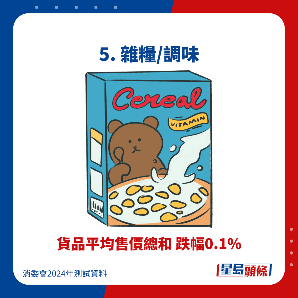 在消委會調查的10款食米中,除了袋鼠牌低升糖指數白米2公斤及熊井美國珍珠米3公斤沒有減價外,其馀8款食米的平均售價都有下跌,包括金象牌頂上茉莉香米5公斤下跌5.5%、賣$65.4;金象牌頂上茉莉香米8公斤下跌3.6%、賣$95.4;袋鼠牌精選絲苗米8公斤下跌4.3%、賣$86.6等。當中北連北海道七星無洗米2公斤的跌幅最大,下跌7.6%、賣$114.2。