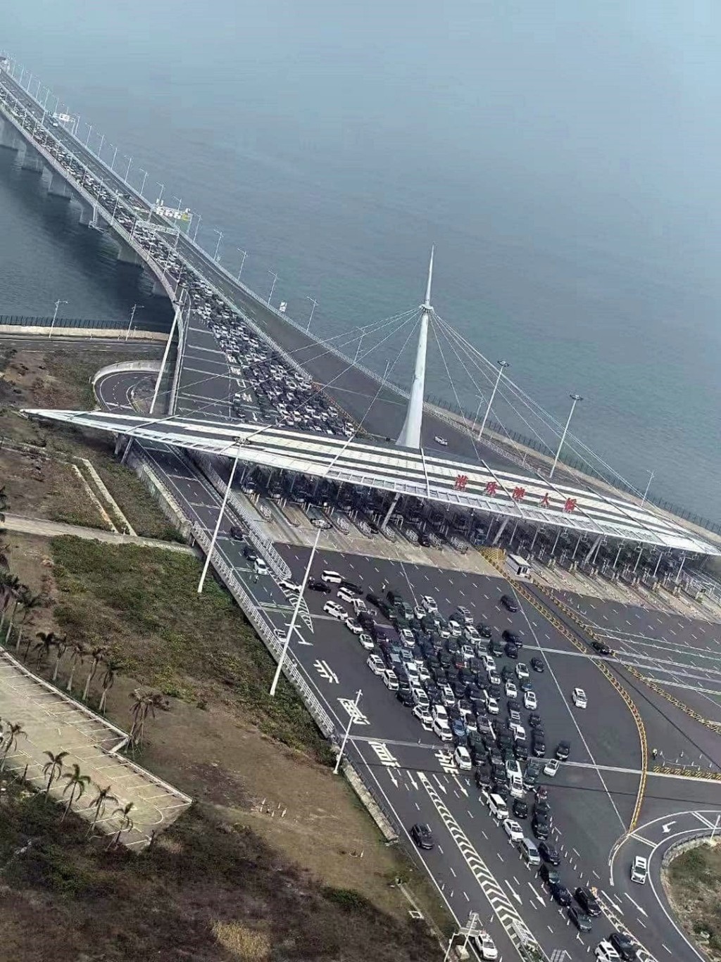 ▲車輛在港珠澳大橋珠海公路口岸等待通關。 新華社