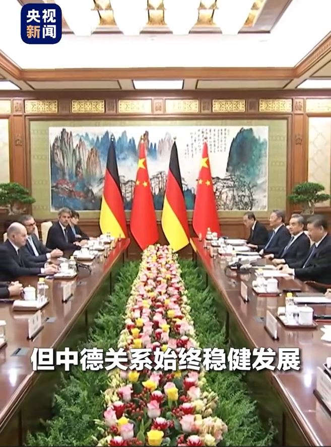 新華社發出的報道表示,習近平在會見朔爾茨時稱,中德是世界第二、第三大經濟體,鞏固和發展中德關系的意義超越雙邊關系范疇,對亞歐大陸乃至整個世界都有重要影響。兩國要從長遠和戰略角度看待和發展雙邊關系,攜手為世界注入更多穩定性和確定性。