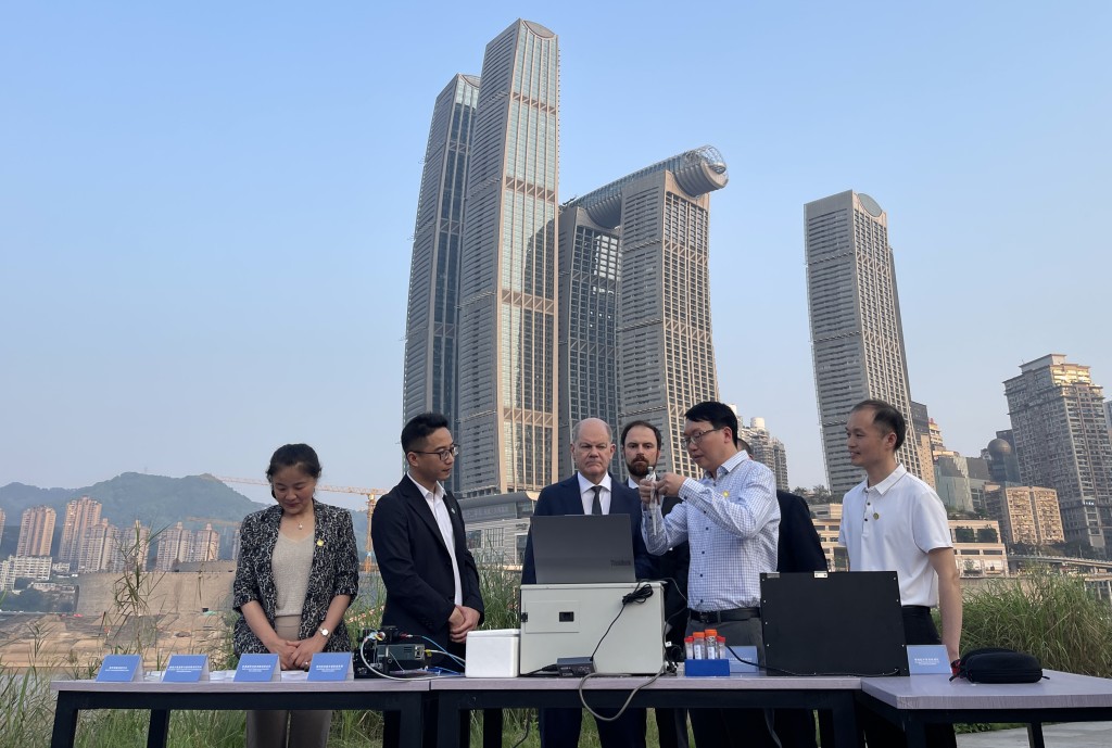 ▲朔爾茨在長江和嘉陵江交匯處了解中德兩國科學家共同開展的水環境污染物高效檢測技術與裝備研究開發項目。(中新社)