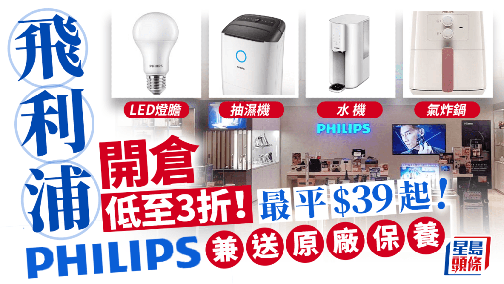 Philips飛利浦陳列品開倉的優惠產品種類豐富,由LED燈膽、臺燈及天花燈,以及抽濕機、空氣清新機、氣炸鍋、按摩器、風筒及電飯煲等統統榜上有名,開倉期間每日更會推出不同款式的限量陳列品,其中原售$388迷你攪拌機減至$188,正價$898的氣炸鍋則以半價發售,同時最平$75起就可以入手電動剃須刀及美發造型器等,同時設有半年原廠保養,買得更加安心!