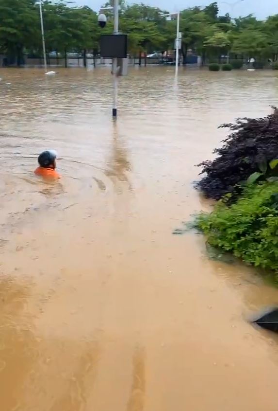 廣東連日暴雨,多處出現嚴重水浸。 韶關昨日受大雨影響,廣泛地區如同澤國,部份水深至人胸口以上,但有被洪水浸至越過肩部的居民,仍然冒險駕著電動單車出行,還向關心他的路人表示,其座駕防水。 影片在網絡熱傳,有網民批評其行為“不要命”,電動單車仍然有漏電危險。